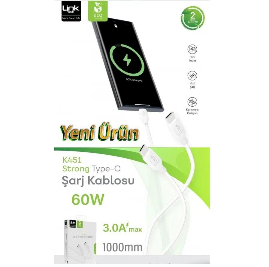 | Etiketler | K451 Link Tech Strong 1M 3A 60W Tip-C › Tip-C Çevre Dostu Şarj Kablosu |