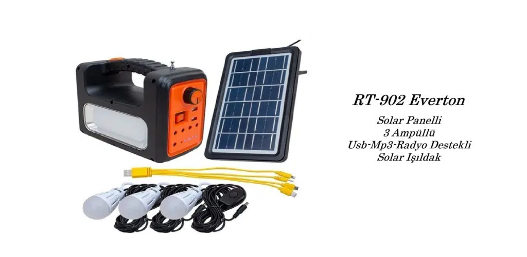 | Etiketler | RT-902BT Everton Solar Panelli 3 Ampüllü Usb-Mp3-Radyo Destekli Solar Işıldak |