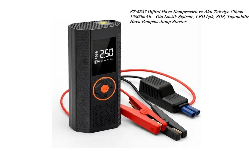 | Etiketler | ST-5537 Dijital Hava Kompresörü ve Akü Takviye Cihazı 12000mAh – Oto Lastik Şişirme, LED Işık, SOS, Taşınabilir Hava Pompası Jump Starter |